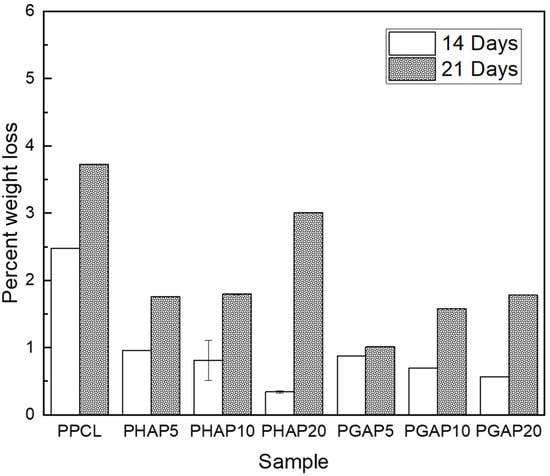 Comparative assessment of in vitro enzymatic degradation, presenting the average percent weight loss for each composite after 14 and 21 days.