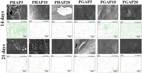 EDS mapping was conducted on the surfaces of the scaffolds after fabrication to examine the difference in the calcium ion intensities between the PHAP and PGAP scaffolds. Among the PHAP series, PHAP10 and PHAP20 showed visibly lower intensities than PHAP5. In contrast, the calcium ion intensity on the PGAP scaffolds remained constant across the different concentrations. The EDS maps (Figure 10) provide a clear view of the elemental composition changes during 14 of the 21-day enzymatic degradation period. Before degradation, both PGAP and PHAP exhibited similar Ca2+ dynamics. However, there was a noticeable difference in the preservation of Ca2+ between PHAP and PGAP. The PGAP series demonstrated a significant preservation of Ca2+, while the PHAP samples showed a noticeable loss in Ca2+.