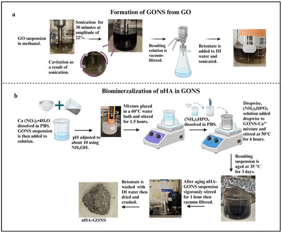 The GONSs were prepared using a low-frequency (LF) ultrasonication technique (Scheme 1a) [18]. Meanwhile, the nHA and nHA–GONSs were prepared via a wet chemical technique (Scheme 1b) [21].