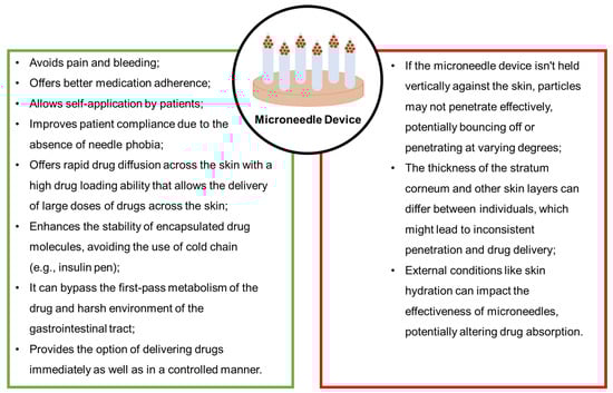 | Polycaprolactone (PCL) | FDA-approved biomaterial; Biocompatible; Biodegradable; Non-cytotoxic; The in vivo degradation products are nontoxic; Sufficient mechanical strength to penetrate porcine cadaver skin for drug delivery. | The processing temperature is comparatively lower than PLA, PGA, and PLGA, yet still above 50 °C, which poses a constraint on incorporating heat-sensitive drugs such as insulin. | [129,133] |
