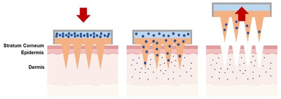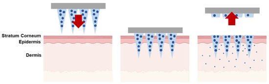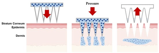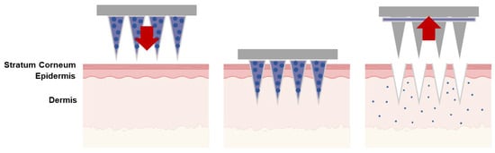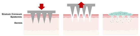 | Solid | The poke-and-patch method involves the application of numerous microneedles to create pores as a preparatory step. Following this, a traditional drug formulation is applied to the skin surface. | Skin pre-treatment for the delivery of potassium chloride, insulin, vaccines, cosmetics, and antipsychotic medication; monitoring of glucose and lactate levels; urea sensing. | [31,32,33,34,35,36,37] |