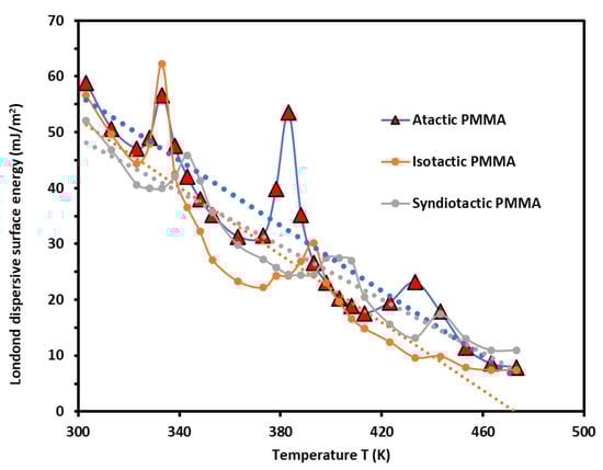 Evolution of the London dispersive surface energy of a-PMMA, i-PMMA, and s-PMMA as a function of the temperature T (K) by using the Hamieh thermal model. Dashed lines correspond to linear approximation.