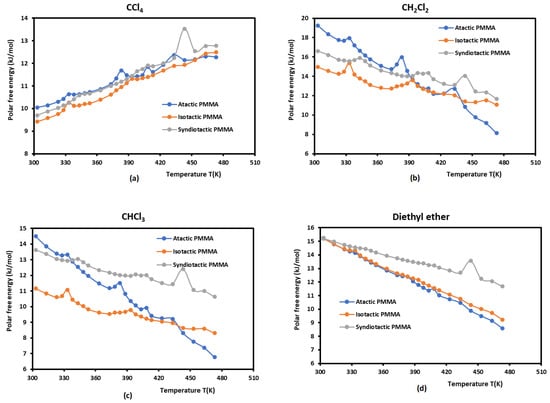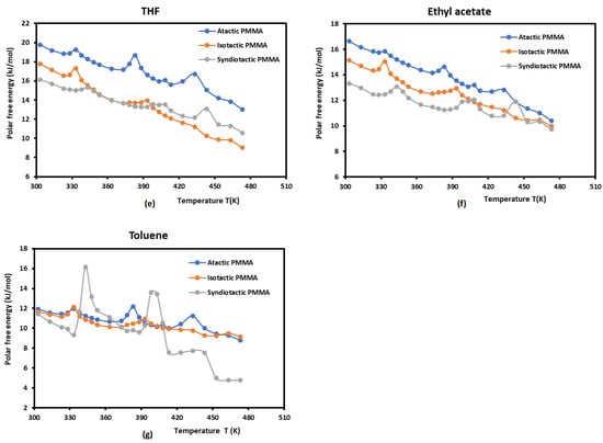 Variations of the polar free interaction energy (kJ/mol) of different polar solvents adsorbed on atactic, isotactic, and syndiotactic PMMAs as a function of temperature: (a) CCl4; (b) CH2Cl2; (c) CHCl3; (d) diethyl ether; (e) tetrahydrofuran (THF); (f) ethyl acetate; and (g) toluene.