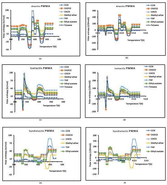 Variations of the polar interaction enthalpy and entropy ( of polar solvents adsorbed on atactic, isotactic, and syndiotactic PMMAs as a function of the temperature: (a) of atactic PMMA (b) of atactic PMMA; (c) of isotactic PMMA; (d) of isotactic PMMA; (e) of syndiotactic PMMA; (f) of syndiotactic PMMA.