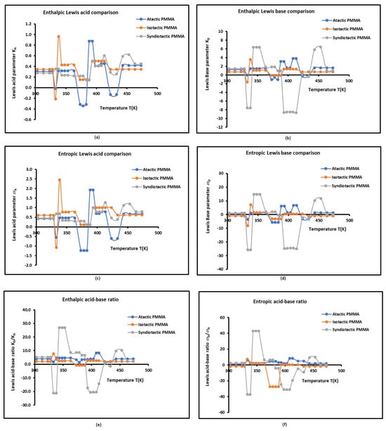 The results in Tables S3 and S4 and Figure 3 with the thermodynamic relations 10 and 11 led to the determination of the enthalpic acid base parameters and and the entropic acid base parameters and of atactic, isotactic, and syndiotactic PMMAs versus the temperature. The non-linearity of () and () of adsorbed solvents necessarily implied the strong variations of the acid-base parameters of PMMAs as a function of temperature. The values of the different enthalpic and entropic acid-base parameters of PMMAs at different tacticities were presented in Table S5 as a function of temperature and led to the corresponding curves in Figure 4. The information collected from Table S5 and Figure 4 is very numerous and precious.