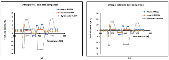 Comparison between the various enthalpic and entropic acid-base parameters of atactic, isotactic, and syndiotactic PMMAs versus temperature: (a): , (b): , (c): , (d): , (e): /, (f): , (g): , and (h): .