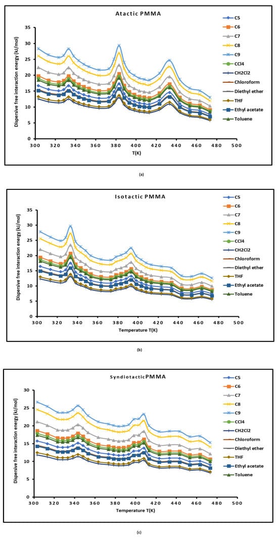 Dispersion free energy of polar solvents adsorbed on atactic, isotactic, and syndiotactic PMMAs as a function of the temperature: (a) atactic PMMA, (b) atactic PMMA, and (c) isotactic PMMA.