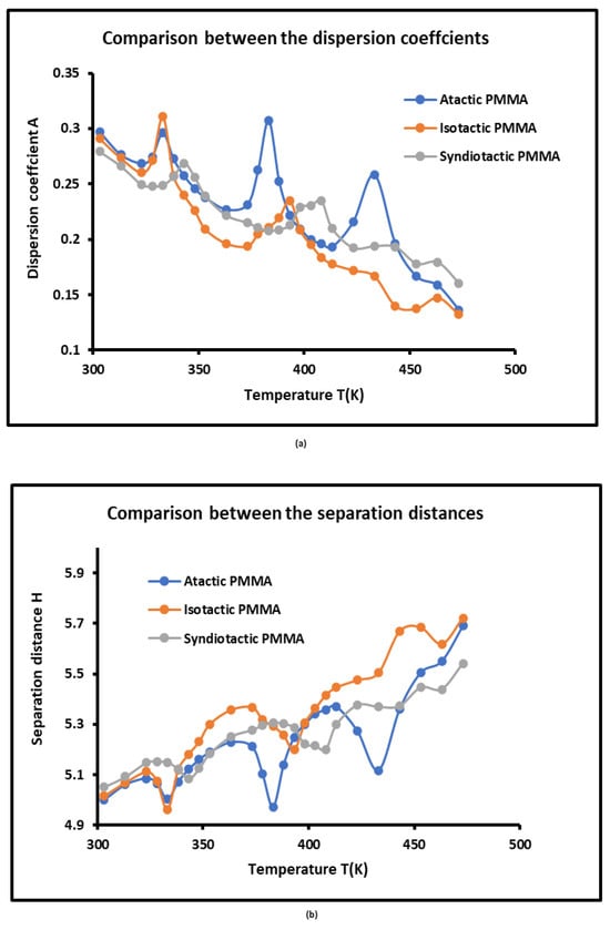 Variations of the dispersion coefficient A (a) and separation distance H (b) of atactic, isotactic, and syndiotactic PMMAs as a function of the temperature.