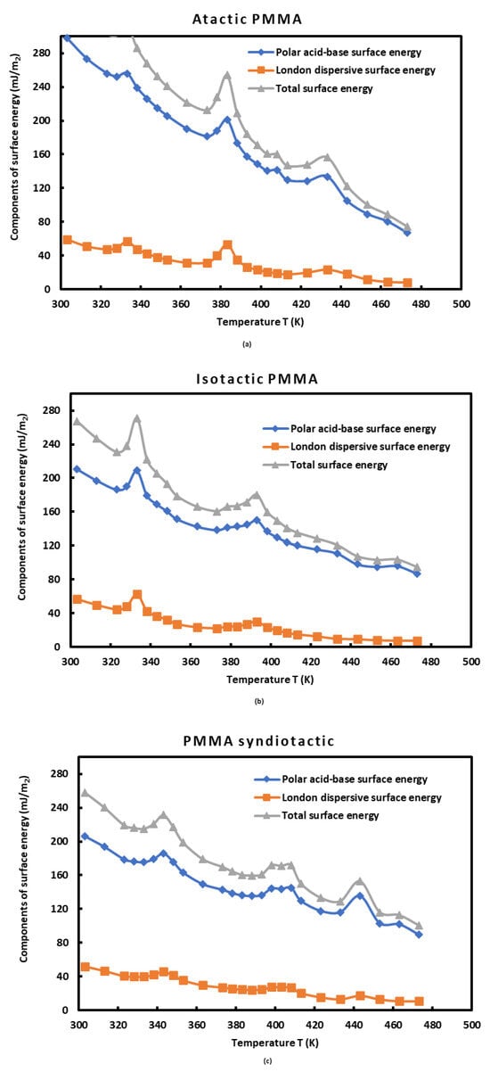 Evolution of the polar acid-base surface energy (mJ/m2), the London dispersive surface energy (mJ/m2), and the Lifshitz—Van der Waals surface energy (mJ/m2) of atactic (a), isotactic (b), and syndiotactic (c) PMMAs as a function of temperature.