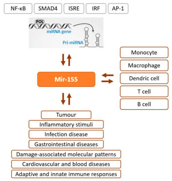 The miR-155 mutual regulatory crosstalk. The NF-κB, SMAD4, ISRE, IRF, and AP-1 transcription factors regulate the miR-155 transcription via POL II in a reciprocal regulatory loop. As shown in the lower part of the figure, there is reciprocal regulatory crosstalk between miR-155 and the listed pathological processes. The cells in which miR-155 activity plays a critical regulatory role are listed on the right.