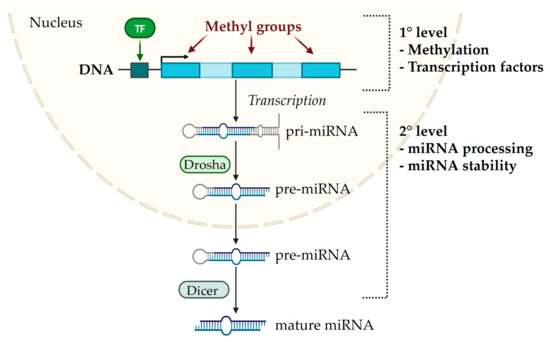 Transcriptional and post-transcriptional regulation of microRNA expression. The figure illustrates the transcriptional regulation of miRNA expression levels (1° level): by transcription factors binding to the miRNA promoter (miRNA upregulation) or by methylation of the miRNA-encoding DNA (miRNA downregulation). The post-transcriptional regulation of miRNA expression levels (2° level) depends on changes in miRNA processing by the endoribonucleases DROSHA and DICER, and on changes in miRNA stability that contribute to the accumulation of miRNAs in the cell. Figure adapted from Gulyaeva et al., J. Transl. Med. 2016 [47].
