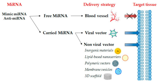 Exogenous mimic miRNA and anti-miRNA delivery strategies to reach the target tissue. Mimic miRNAs can be introduced into the organism as free miRNAs or as miRNA coupled to a carrier. The fate of the first is different from that of the second. Free miRNAs are introduced into the bloodstream directly. These miRNAs are not protected from the action of RNases and do not cross the cell phospholipid barrier. MiRNAs coupled to carriers are apt to cross the cell phospholipid membrane. MiRNAs coupled to carriers are distinguished depending on the type of vector into two main types: miRNA coupled to viral vectors and miRNA coupled to non-viral vectors. The principal viral vectors are adenovirus, adeno-associated virus, lentivirus, and retrovirus. Non-viral vectors are further subdivided into distinct delivery-based categories, utilizing lipid-based nanocarriers, polymers, inorganic materials, vesicles derived from cell membranes, and 3D scaffolds.