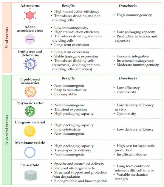 Viral and non-viral vectors for miRNA delivery. The figure shows the main advantages and disadvantages of viral and non-viral vectors used for miRNA delivery: adenoviruses, adeno-associated viruses, lentiviruses, and retroviruses (viral vectors); lipid-based nanocarriers, polymeric vectors, inorganic materials, membrane vesicles, and 3D scaffolds (non-viral vectors). Figure adapted from Dasgupta et al. Methods and Protocols, 2021 [64].