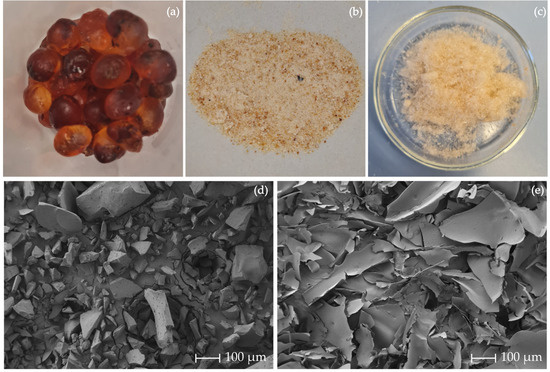 (a) Raw peach gum PG, (b) dried PG powder, (c) peach gum polysaccharide PGP, (d) optical microscope image of PG particles, and (e) FESEM micrographs of PG and PGP particles.