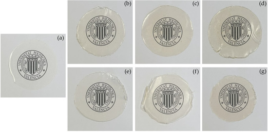 The visual appearance of TPS films containing (a) pure TPS, (b) 5 phr of PG, (c) 10 phr of PG, (d) 15 phr of PG, (e) 5 phr of PGP, (f) 10 phr of PGP, and (g) 15 phr of PGP.