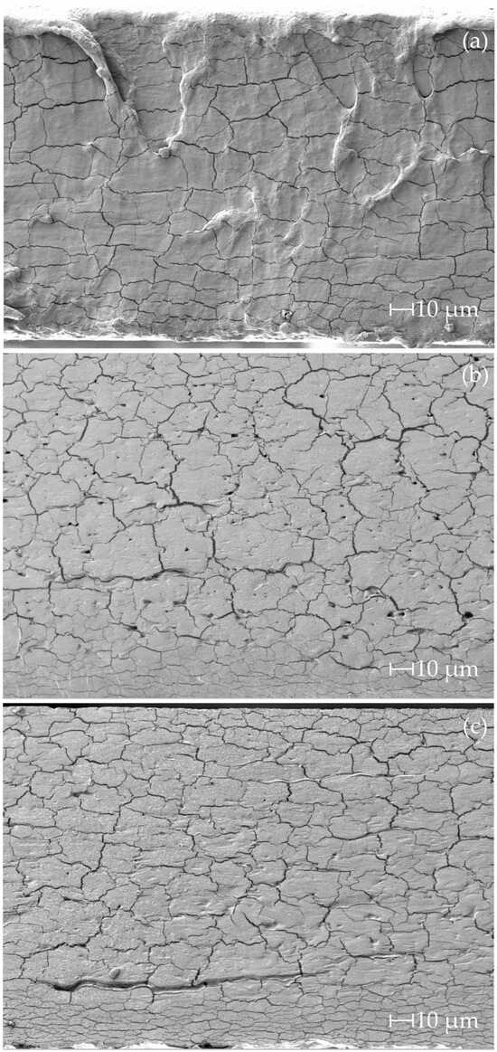 Figure 3 shows a comparative study performed by FESEM on the cryofracture cross-sections of TPS, TPS-15PG, and TPS-15PGP films. First, the TPS film (Figure 3a) has a ductile fracture with a homogeneous and smooth surface, confirming the plasticization of starch with glycerol and water. The cracks observed in the surface could be attributed to the cryofracture of the films. PG and PGP are expected to be compatible with starch due to their hydroxyl groups and structural similarity [11,15]. The addition of 15PG in TPS changes the film’s microstructure, making more pores and microcracks appear all over the surface. The size of the pores matches the observed size for PG particles in optical microscopy, which suggests that PG is not miscible with TPS and presents a lack of cohesion in contents of 15 phr. The pores and microcracks produced in the film with the addition of PG may adversely impact the mechanical and barrier properties of the films. On the other hand, adding PGP in 15 phr does not produce more pores or microcracks in TPS, pointing to good miscibility of the materials. This difference in the miscibility of PG and PGP observed in FESEM shows the change in the properties of PGP concerning PG, suggesting an improvement in film manufacturing.