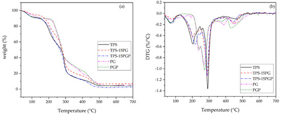 Figure 4 shows the thermogravimetric analysis curves (TG) and first derivative thermo-gravimetry (DTG) curves for TPS films and their formulations with PG and PGP. Table 5 presents the main thermal parameters obtained from the thermogravimetric curves, which correspond to the onset degradation temperature, which was taken into consideration for the temperature with a loss of 5% (T5%); to the maximum degradation rate temperature (Tmax1, Tmax2); and to the residual mass at 700 °C. Three distinct mass losses were observed during the degrading process, attributed to water evaporation, polysaccharide decomposition, and charring. The weight loss peaked at 70 °C and was associated with the evaporation of absorbed water. The polysaccharide decomposition was noted between 150 and 350 °C. The loss peaks at about 240–250 °C, probably due to the degradation of the branches which were easily separated from the main chain and degraded to volatiles evolving out at relatively lower temperatures. The chain’s backbone was pyrolyzed at much higher temperatures [29]. The maximum weight loss rate increase was obtained at about 280 °C for TPS films and 270 °C for PGP. The DTG curves indicated that no obvious pyrolysis occurred at temperatures above 350 °C. Above 400 °C, the degradation is related to the thermo-oxidative degradation of the char produced during the first degradation step. The DTG curve of PG and PGP showed a low mass loss rate, suggesting a higher thermal stability than neat TPS. It was mainly attributed to the mixtures of polysaccharides in their composition. Moreover, it is observed that PG provides thermal stability to TPS when added in 15 phr. At the same time, TPS-15PGP presents a similar thermal stability to neat TPS that could be related to water solubility, as PG is a non-water-soluble PG bond that is hard to decompose.