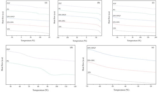 Figure 5 shows the differential scanning calorimetry (DSC) curves for TPS, TPS-15PG, TPS-15PGP, raw PG, and PGP, whereas Table 5 shows the differential scanning calorimetry (DSC) parameters. The first heating curve shows the glass transition temperature (Tg) of PG and PGP at 89.48 °C and 67.15 °C, respectively. The second heating curve shows the Tg of the TPS films. It is observed that PG and PGP produce a negligible change in the TPS glass transition temperature, which is around −59 °C. The lack of change in Tg may be due to the small content of additives and the fact that all the materials are amorphous. As TPS is mainly an amorphous material, it does not present a melting point [30].