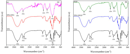 (a) Fourier transform infrared (FTIR) spectra, from bottom to top of raw peach gum (PG), TPS-15PG, and neat TPS, (b) Fourier transform infrared (FTIR) spectra, from bottom to top of peach gum polysaccharide (PGP), TPS-15PGP, and neat TPS.