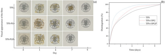 Figure 7a depicts the visual appearance and the disintegration degree under composting conditions as a function of the time of neat TPS, TPS-PG, and TPS-PGP films.
