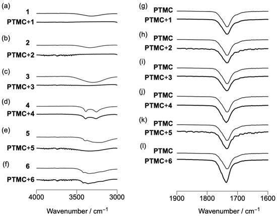 In addition, the stretching of the hydroxyl groups of 4, 5, and 6 slightly shift in the blend samples (Figure 3d–f). The slight shift of hydroxyl peaks to higher wavenumbers for samples 3, 4, 5, and 6 might imply a reduction in the amount of hydrogen bonding or changes in hydrogen bonding from OH/OH to OH/C=O. The peak intensity decrease on hydroxyl stretches might also show a possible penetration of hydroxyl groups into the PTMC surface. Similar phenomena on peak intensity changes in hydroxyl stretches have been observed when studying the temperature-responsiveness of poly(dodecyl methacrylate) [42]. The increased OH-absorbance results from an increased ethanol concentration at the sensing surface, and an increased temperature in 3350 cm−1 of poly(dodecyl methacrylate) showed ethanol penetration, thus enabling the polymer to swell [42]. All the stretching of the carbonyl groups in the blends of PTMC with 1, 2, 3, 4, and 5, however, showed at 1736 cm−1 (Figure 3g–k), although the blend of PTMC and 6 shifted slightly to 1738 cm−1 (Figure 3i).