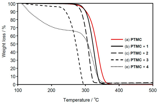 The thermal properties of the blends with PTMC and various hydroxyl groups were analyzed with TGA measurement, prepared with the melt blending method for a homogeneous sample preparation. The thermal decomposition temperatures of samples with 10% weight loss (T10) were used for comparison, as well as chart patterns. Compared with PTMC only (Figure 4 line a), the mixing of 1 and 2 with PTMC with a 1:1 mole ratio slightly reduced the T10 of PTMC from 302 °C to 301 °C and 288 °C (Figure 4 line b,c). Since the FT-IR spectra (Figure 3) showed a possible evaporation of 1, 2, and 3 by the disappearance of the hydroxyl peak, most alcohols do not exist in the mixtures; that is why only a slight change was observed. However, it is possible to have interactions of PTMC with 3 and 4 due to a reduction of the T10 in pure PTMC.