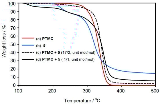 The TGA curves of PTMC show a one-step thermal decomposition process (Figure 5 line a), while 5 shows two steps of the thermal decomposition processes (Figure 5 line b), which are the first thermal decomposition temperature (Td1st) at 218 °C and the second thermal decomposition temperature (Td2nd) at 276 °C. Previously, it was reported that the first decomposition of pure 5 is related to it starting to lose its crystalline structure, while the second is related to decomposition of the stronger chemical bonds after the complete loss of the crystalline structure [51,52,53]. Interestingly, the Td1st in the blend of PTMC with 5 (17/2, mol/mol) appears to have disappeared, and the T10 increased to 310 °C, whereas only the PTMC showed T10 at 302 °C (Figure 5 line c). This improvement of the thermal properties suggests the interaction of PTMC and 5. When it was compared with a degradation temperature at approximately a 55% loss of weight, the blend of PTMC with 5 (1/1, mol/mol) showed at 339 °C, as well as the blend of PTMC with 5 (17/2, mol/mol), despite the low values of 318 °C and 331 °C for 5 and PTMC, respectively. This result implied that a slight interaction between PTMC and 5 possibly occurs.