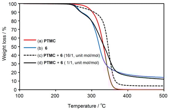 These phenomena were also more clearly observed in the blend of PTMC with 6 (16/1, mol/mol), which showed the T10 values at 307 °C, improved from 302 °C in the case of only PTMC (Figure 6 line a,c). When it was compared with the degradation temperature at approximately a 34% loss of weight, both blend samples showed similar temperatures of 351 °C that were above either 6 at 336 °C or PTMC at 339 °C. This result also suggested the possibility of an interaction between PTMC and 6.