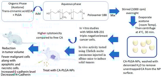 - Badawi, N.M.; Attia, Y.M.; El-Kersh, D.M.; Hammam, O.; Khalifa, M.K.A. Investigating the Impact of Optimized Trans-Cinnamic Acid-Loaded PLGA Nanoparticles on Epithelial to Mesenchymal Transition in Breast Cancer. Int. J. Nanomed. 2022, 17, 733–750. [Google Scholar] [CrossRef]