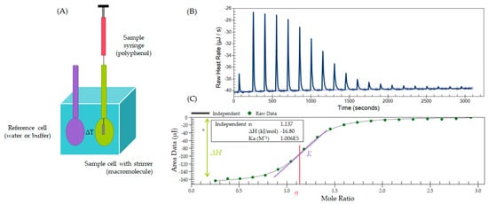There are various methods to study the interactions between polyphenols and biological macromolecules [2,3]. For example, non-covalent associations between polyphenols and proteins have been studied by using (i) direct methods in dilute solutions, for instance, by isothermal titration calorimetry (ITC), equilibrium dialysis, size exclusion or affinity chromatography, nuclear magnetic resonance spectroscopy, mass spectrometry, and small angle scattering techniques for X-ray and neutrons; (ii) precipitation methods, such as protein precipitation, competitive binding assay, turbidimetry, nephelometry or dynamic light scattering; (iii) indirect study of the consequences of the interaction on the enzyme activity as earlier reviewed by Le Bourvellec and Renard [3]. Of these techniques, ITC is particularly interesting, as it is direct and quantitative, elucidates the thermodynamic profile of the interaction and can also reveal structural relationships. Generally, ITC is a widely used technique in different areas of research for studying intermolecular interactions, primarily for interactions between small molecules and biological macromolecules, such as protein–ligand or metal–ligand interactions [12,13,14], partition to membranes or polymer surfactant interactions [15], but recently also for binding interactions between synthetic polymers and small molecules, ions, or nanoparticles [16]. It can examine the thermodynamics of polyphenol–macromolecule interactions, providing insights into binding processes and affinities (binding constant Ka), stoichiometry, or the number of binding sides (n), and thermodynamic parameters, such as enthalpy changes (ΔH), binding entropies (ΔS), and the Gibbs free energy of association (ΔG). If the measurements are performed in different temperatures, the change in the heat capacity of the binding process (ΔCp) can also be calculated [15,17]. As all biomolecular interactions include changes in heat energies, ITC can offer a comprehensive thermodynamic profile of an interaction process with benefits including reduced sample amounts and the absence of chemical modification or labeling requirements. In addition, it tolerates possible precipitation happening during the interactions and does not limit the size of the interacting species [18]. At its best, it can produce information about the nature of the driving forces responsible for the binding.