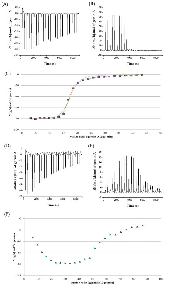 Examples of strong interaction showing raw data of (A) gemin A into buffer control titration, (B) gemin A into 20 µM gelatin titration, and (C) one-site (green dashed line) and two-site (red dashed line) binding models fitted to experimental data of this interaction; and of weaker interaction showing raw data of (D) geraniin into buffer control titration, (E) geraniin into 10 µM gelatin titration, and (F) binding isotherm for this interaction [29]. Exothermic reactions are shown up. Figure 3C,F are reprinted with permission from Ref. [29], Ellagitannins with glucopyranose cores have higher affinities to proteins than acyclic ellagitannins by isothermal titration calorimetry, Maarit Karonen, Marianne Oraviita, Irene Mueller-Harvey, Juha-Pekka Salminen, and Rebecca J. Green, Journal of Agricultural and Food Chemistry 2019, 67 (46), 12730–12740, DOI: 10.1021/acs.jafc.9b04353. Copyright © 2019 American Chemical Society.