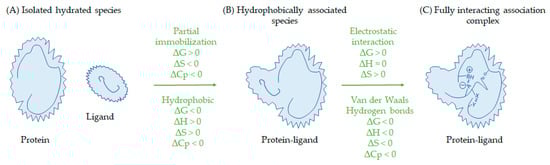 Adaptation of the hypothetical thermodynamic model of the protein reacting with ligand [65]: (A) isolated hydrated species, (B) partial interact with mutual penetration of their hydration layers, and (C) fully interacting association complex. The first step includes partial immobilization and hydrophobic association and the second step all other intermolecular interactions (ionic interactions, hydrogen bonds, and van der Waals interactions). As in the initial scheme, the irregular surrounding outlines of protein and ligand expresses ordered domain of water in comparison to other solvents. Adapted with permission from Ref. [65], Thermodynamics of protein association reactions: forces contributing to stability, Philip D. Ross and S. Subramanian, Biochemistry, 1981, 20 (11), 3096–3102, DOI: 10.1021/bi00514a017. Copyright © 1981 American Chemical Society.