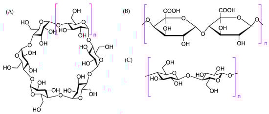 Model polysaccharides exhibiting associations with polyphenols: (A) cyclodextrins consisting of α-(1→4)-linked cyclic oligosaccharides of which as examples α-cyclodextrin (n = 1) and β-cyclodextrin (n = 2), (B) pectins, rich in galacturonic acid, of which as an example homogalacturonans having the linear chains of α-(1→4)-linked D-galacturonic acid units, and (C) cellulose consisting of the linear chains of β-(1→4)-linked D-glucose units, n can vary from a few hundreds to many thousands.