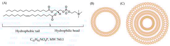 (A) 1-palmitoyl-2-oleoylphosphatidylcholine as an example of a model lipid studied for its interaction with polyphenols, (B) unilamellar vesicle consisting of a single phospholipid bilayer, and (C) multilamellar vesicle consisting of many phospholipid bilayers. The vesicles differ in scale, yet they serve as structural examples.