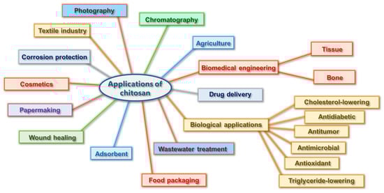 - Thambiliyagodage, C.; Jayanetti, M.; Mendis, A.; Ekanayake, G.; Liyanaarachchi, H.; Vigneswaran, S. Recent Advances in Chitosan-Based Applications—A Review. Materials 2023, 16, 2073. [Google Scholar] [CrossRef]
