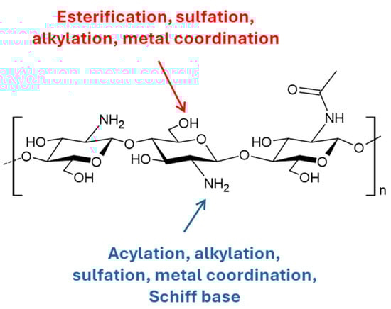 - Elnaggar, E.M.; Abusaif, M.S.; Abdel-Baky, Y.M.; Ragab, A.; Omer, A.M.; Ibrahim, I.; Ammar, Y.A. Insight Into Divergent Chemical Modifications of Chitosan Biopolymer: Review. Int. J. Biol. Macromol. 2024, 277, 134347. [Google Scholar] [CrossRef]