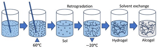 Formation of starch aerogel precursor through the sol-gel process followed by retrogradation and solvent exchange. At 60 °C, starch granules swell and rupture, releasing amylose and amylopectin, forming a sol. Over time, these molecules interact, creating a three-dimensional gel network that traps water, forming a hydrogel. The gel is then slowly cooled, allowing amylose and amylopectin chains to reassociate into a semi-crystalline structure through retrogradation. Finally, water in the gel is replaced with ethanol via solvent exchange, resulting in a highly porous aerogel precursor or alcogel.