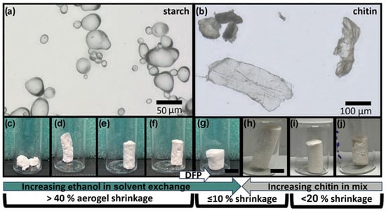 Potato starch aerogels (PSAs) and chitin/potato starch blend aerogel (C-PSA). (a) Potato starch under an optical microscope (scale bar 100 µm). (b) Chitin under an optical microscope (scale bar 100 µm). (c–g) PSA 1.1–1.5 samples fabricated (Table 2), using alternate sol-gel preparation processes described in Table 1. (h–j) C-PSA 1.3, 1.2, and 1.1, respectively (Table 3). The scale bar for aerogel is 10 mm.