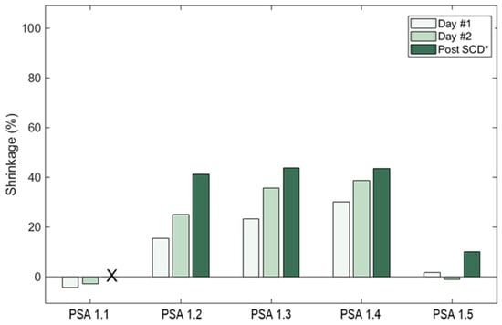 Sample shrinkages (%) after the first two solvent exchange baths and after supercritical drying (SCD). X: No value shown because PSA 1.1 lost all structure after SCD. * Post-SCD shrinkages are reported to show the differences after all water baths were completed and after all ethanol baths were completed.