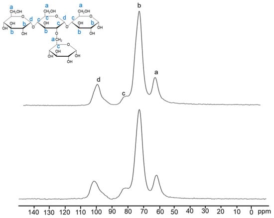 C13-NMR spectra of potato starch (top) and PSA 1.5 (bottom). The x-axis shows chemical shifts in ppm (parts per million). Peaks are labeled based on carbon positions and associated functional group environments in the starch structure: (a) ~62 ppm, (C-6, –CH2O-), (b) ~73 ppm, alcohol (C-2, C-3, C-5, –CHOH), (c) ~82 ppm, (C-4, involved in -CO-), and (d) ~101 ppm, ether-linked carbon (C-1, O-C-O). PSA 1.5 shows increased intensity at ~82 ppm, indicating network change after gel formation.