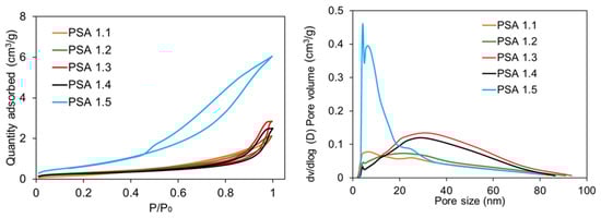 (Left) adsorption–desorption curves and (right) pore size/volume distribution of aerogel samples PSA 1.1, PSA 1.2, PSA 1.3, PSA 1.4, and PSA 1.5.