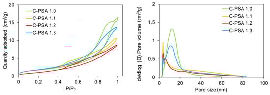 The adsorption–desorption curves of C-PSA with varying w/w% chitin (Figure 7) showed increased adsorption ability compared to PSA samples with no chitin. Surface areas for C-PSA 1.1, 1.2, and 1.3 contained 151.6, 90.1, and 150.2 m2/g, respectively (Table 3). The addition of 2.5 wt% chitin yielded a better adsorption property than 5 wt% chitin. Out of the other C-PSA samples shown herein, 7.5 wt% had the highest C-PSA adsorption curve.