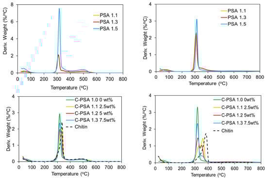 (Top) derivative weight vs. temperature curves of PSA 1.1, 1.3, and 1.5 in air (left) and nitrogen (right); (bottom) derivative weight vs. temperature curves of C-PSA 1.0, 1.1, 1.2, 1.3, and chitin in air (left) and nitrogen (right).