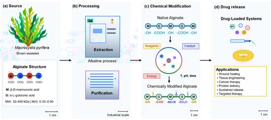 Chemically modified alginate-based hydrogel matrices for drug delivery. (a) Marine source and molecular structure. (b) Processing methods on an industrial scale. (c) Chemical modification. (d) Drug-loaded delivery systems. Scale bars indicate dimensional ranges from the molecular (1 nm) to macroscopic (1 cm) levels.