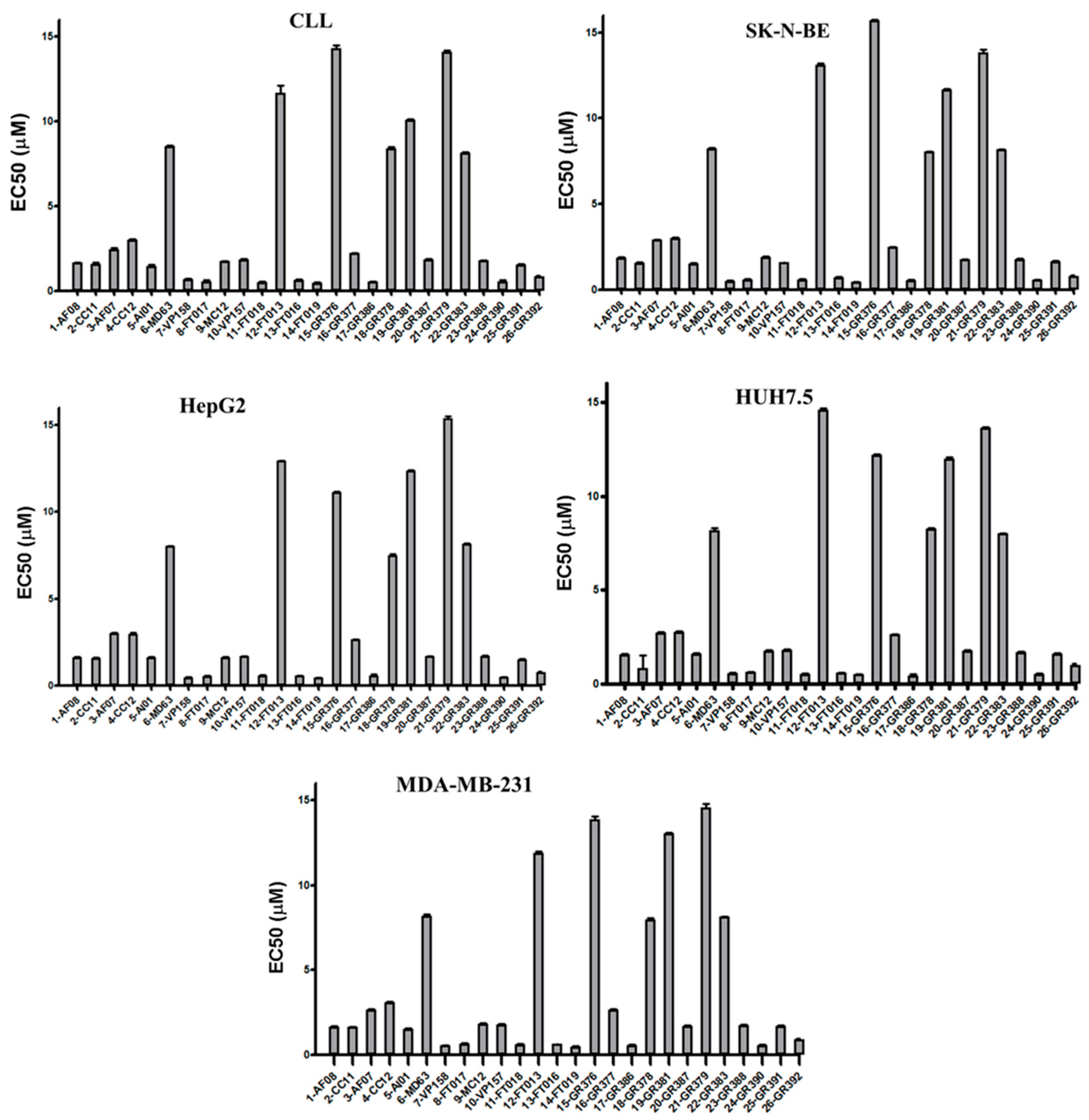- Zagotto, G.; Ribaudo, G.; Brunati, A.M.; Pagano, M.A.P.; Tibaldi, E.; Trentin, L. 1-Phenylpropanone Compounds and Use Thereof. WO2018060947A1, 4 May 2018. [Google Scholar]