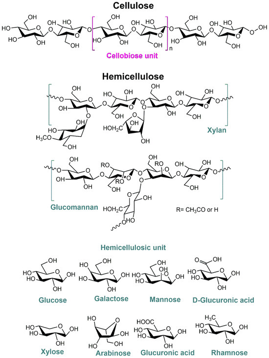 Chemical structure of cellulose and hemicellulose polysaccharides.