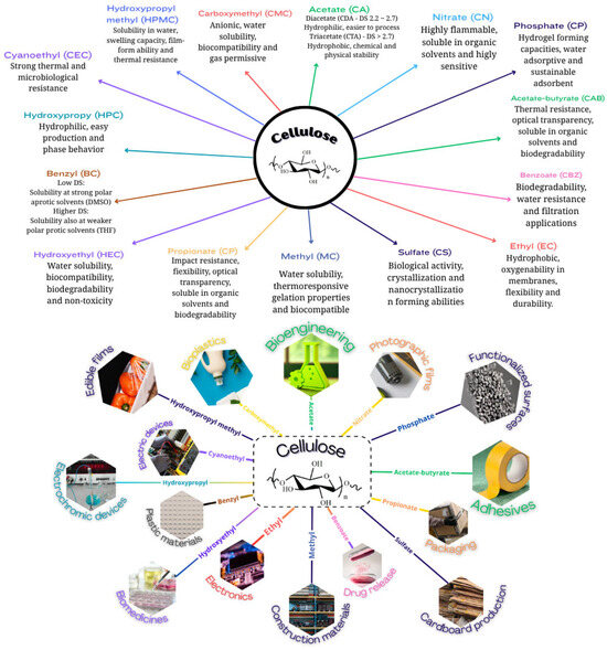 Following extraction, the conversion of cellulose and hemicellulose into derivatives via esterification or etherification represents a critical step toward functional materials. Cellulose and hemicellulose esters and ethers are the two most widely explored classes of lignocellulosic derivatives, attracting increasing interest as functional and sustainable materials with improved physicochemical properties and broad industrial applicability [27,28,29], since modification provides tailored solubility, stability, and functional properties, supporting applications across materials, food, biomedical, packaging, and environmental sectors [6,8,30,31]. Cellulose esters such as cellulose acetate (CDA, CTA), cellulose acetate butyrate (CAB), cellulose acetate propionate (CAP), cellulose nitrate (CN), cellulose sulfate (CS), and cellulose benzoate (CB) have long been employed in biodegradable films, coatings, textiles, and photographic materials, as well as in pharmaceutical and food formulations, due to their excellent film-forming ability, strength, and chemical resistance [32]. Similarly, hemicellulose esters (e.g., acetates, propionates) enhance hydrophobicity, processability, and film-forming properties, enabling applications in bio-based packaging, coatings, hydrogels, and controlled-release biomedical systems [33,34,35].