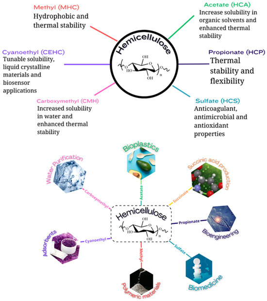 - He, Y.; Liu, Y.; Zhang, M. Hemicellulose and Unlocking Potential for Sustainable Applications in Biomedical, Packaging, and Material Sciences: A Narrative Review. Int. J. Biol. Macromol. 2024, 280, 135657. [Google Scholar] [CrossRef]