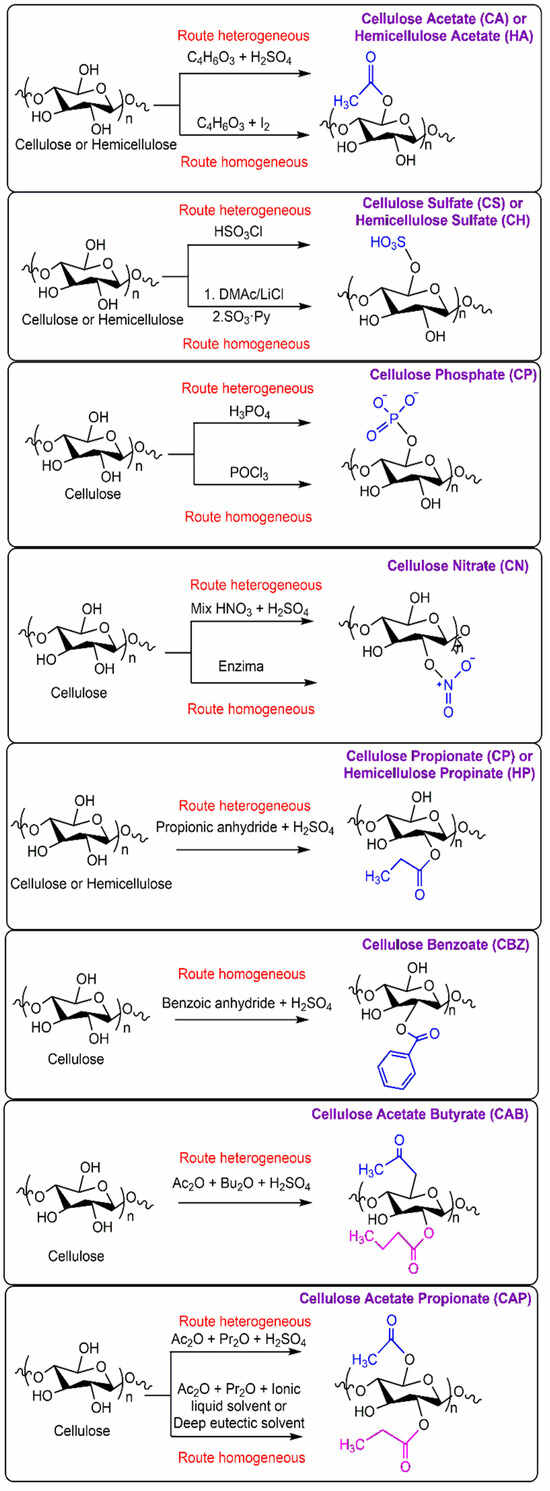 Cellulose esters are among the most important derivatives of cellulose, obtained through esterification of hydroxyl groups present in the polymer backbone. This modification improves solubility, thermal stability, and processability, expanding their applicability compared to native cellulose. Common examples include cellulose acetate, cellulose nitrate, and cellulose propionate, each with specific physicochemical properties tailored for different uses. These materials are widely employed in coatings, films, membranes, and drug delivery systems due to their biodegradability and mechanical strength. Additionally, cellulose esters can serve as renewable alternatives to petroleum-based polymers, contributing to sustainable material development. Their versatility makes them key materials in industries ranging from packaging and textiles to pharmaceuticals and biomedical engineering. The reaction pathways for the production of polysaccharide esters are illustrated in Figure 4.
