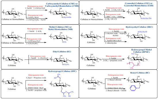 Cellulose ethers are widely studied cellulose derivatives, obtained through the etherification of hydroxyl groups in the cellulose chain. This modification enhances water solubility, chemical stability, and rheological properties, making them more versatile than native cellulose. Common examples include carboxymethyl cellulose (CMC), hydroxyethyl cellulose (HEC), and methylcellulose (MC), each presenting distinct characteristics suitable for specific applications. These derivatives are extensively used as thickeners, stabilizers, emulsifiers, and film-forming agents in the food, pharmaceutical, cosmetic, and construction industries. Due to their biocompatibility and non-toxicity, cellulose ethers are also applied in drug delivery systems and biomedical formulations. In addition, their renewable origin and biodegradability make them environmentally friendly alternatives to synthetic polymers. The reaction pathways for the production of the polysaccharide ethers are illustrated in Figure 5.